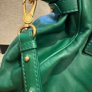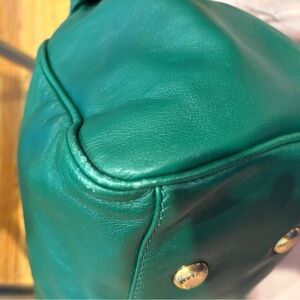 Hardware is in nice shape. Leather is so soft and supple, bag has a slouchy silhouette. Exterior in very nice condition. A bit of wear at corners (see pic), one faint white spot on back of bag (see video). Feet show a little wear on bottom.