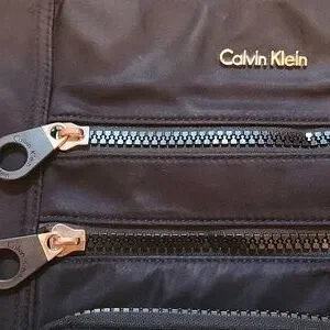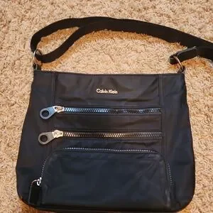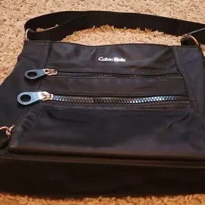 Calvin Klein crossbody bag in black. Features multiple zippered compartments for convenience. fun circle zipper pulls on front! bottom front compartment has built in CC slots and ID slot!