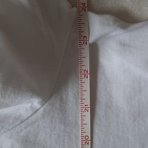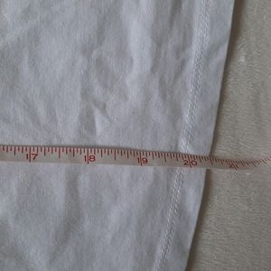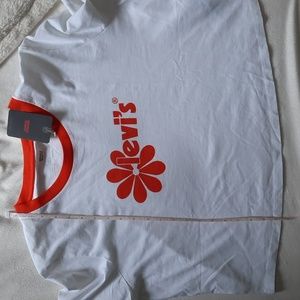 white crop top with orange around the collar and also says Levi's on front with a Flo. super cute. would be great alone or layered under a cute jacket.