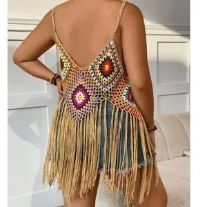 Plus Multicolor Floral Semi Sheer Crochet Fringe Hem Tank Top