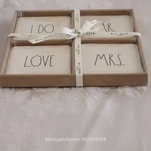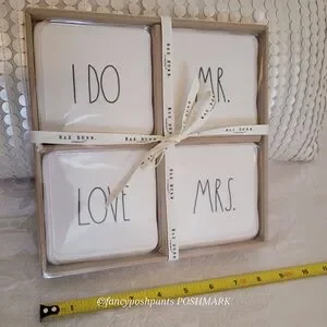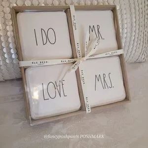 Rae Dunn wedding-themed coasters. The coasters are square, white ceramic with black lettering, and each has a different word: "I DO," "MR.," "LOVE," and "MRS."