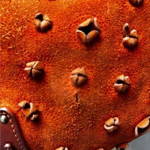 Authenticated Louis Vuitton Onatah Fleur GM in orange suede leather. This is a limited Edition creation designed by Marc Jacobs Y2K. It features brown leather and bronze hardware details. The bag has suede flowers and the classic monogram logo. It has a zipper closure and inside has soft brown leather lining and one slip pocket. Can be carried on the shoulder with the striped adjustable strap. The bag has overall darkening due to the nature of suede and that it is vintage, just evident usage. It has a few minor tears (see photos)