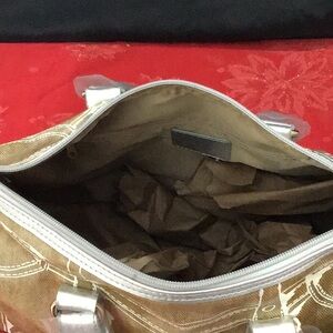 Purse has 2 open side pockets & front & back zippered compartments. It can be worn as a shoulder bag as well as a hand bag. It is NWT. Price reflects slight flaw on very bottom of bag as shown in the photo. It is like a bubble in the material. Handbag is manmade material made to look like jeans. It is approx 14 1/2” wide X 11” tall X 5” deep. Large central compartment.