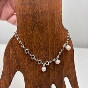 Elegant silver bracelet featuring heart cutouts and pearls. Perfect for adding a touch of sophistication to any outfit.