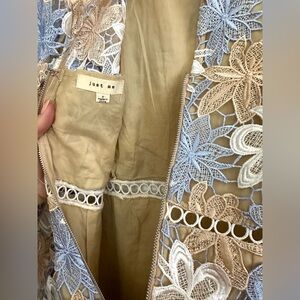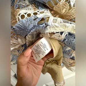 Just me guipure blue,tan, and white laced mini dress w long sleeves size small