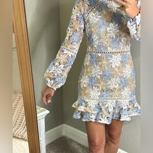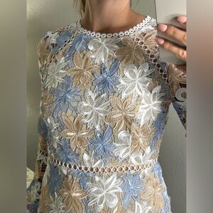 Just me guipure blue,tan, and white laced mini dress w long sleeves