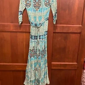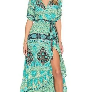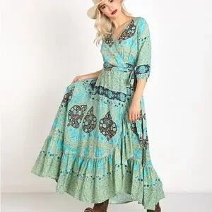 Embrace a bohemian vibe with this stunning teal maxi dress. Perfect for any occasion, this dress offers a flowy silhouette and intricate patterns.