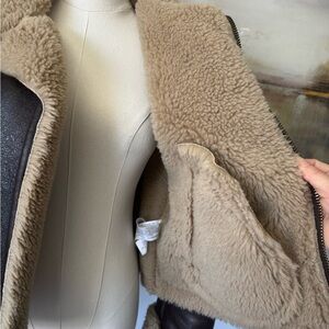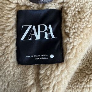 Stylish Zara jacket with a rich brown leather exterior. Soft cream shearling lining and accents. Perfect for a chic, warm look.