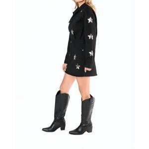 Elevate your wardrobe with the Raelynn Denim Mini Dress by BUDDYLOVE, a perfect blend of style and comfort. This women's mini dress features long sleeves and a textured A-line silhouette, crafted from 100% Polyester for a relaxed fit with stretch. Designed with practicality in mind, it includes pockets and a snap closure, ideal for effortless wear. The classic black hue pairs beautifully with its unique star patch details and raw hem, showcasing a playful touch.