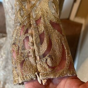 Stunning gold gown with intricate lace details. Long sleeves and a small train add elegance. New but tried on. Comes with a small bead packet as may have some loose threads or missing beads.