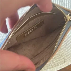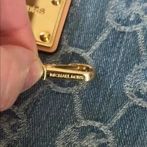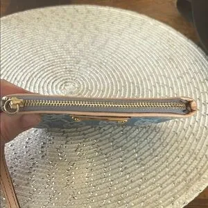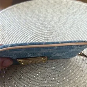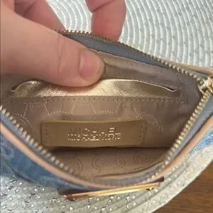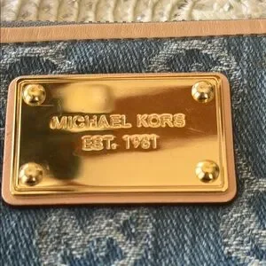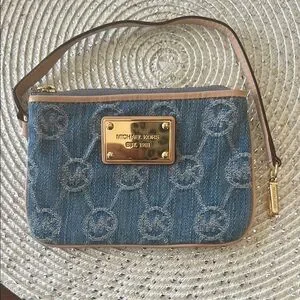 Stylish and versatile, this Michael Kors wristlet in blue denim is perfect for any occasion. The gold accents add a touch of elegance.