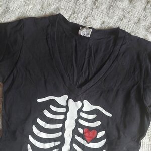 Black tee with a skeleton and red heart graphic. Features a playful design.
