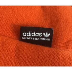 This Adidas Skateboarding Pullover Hoodie is designed for men in a vibrant orange color, featuring a classic pullover style. The hoodie is part of the adidas Skateboarding line. Both pockets have a zipper. Interior is a soft fleece. Great condition with no visible signs of wear.