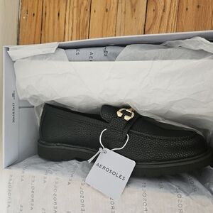 Stylish black loafers by Aerosoles. Perfect for any occasion. man made upper with gold hardware. stylish and classic, size 9 fits true to size. Definitely more on the narrow side. Only ever tried on, new in box. NEVER WORN, brand new.