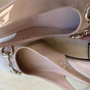 New Gucci Nude Patent Leather Slingback Block Heel, Lady Tan Horsebit Size 8 US