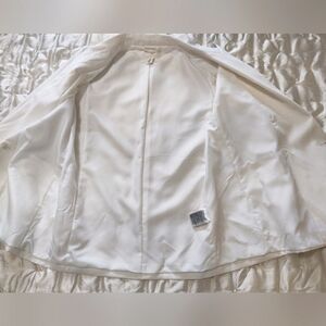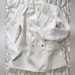summer closet staple, beautiful H&M oversized lined white blazer. faux double breasted with one button closure, 2 faux front pockets, shoulder pads, size medium NWOT.