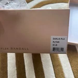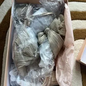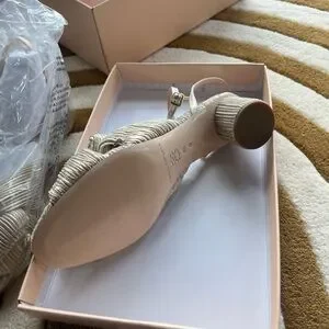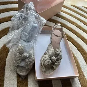 These Loeffler Randall heels feature a luxurious metallic champagne color with wide, crisscrossing pleated straps and a decorative bow for a feminine touch. The medium-height block heel adds stability and style, while the thin ankle strap ensures a secure fit.