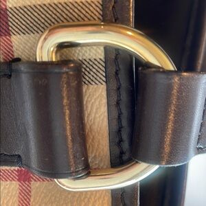 Stylish Burberry tote bag with classic plaid design. Features brown leather handles with gold trim. This is a beautifully kept vintage bag. There is minimal wear on one handle and No corner wear. The inside is in great condition along with the bag itself.