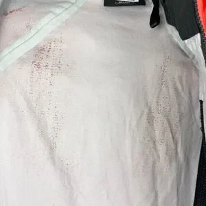 Condition is good overall. Light staining and some peeling on the inside hood and inner lining as shown.