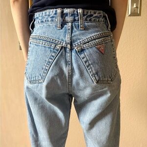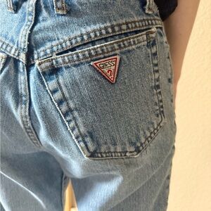 These rare vintage Guess blue jeans from the 80s are so fun! They have a high waist, tapered legs with ankle zippers, and classic triangle logo on the back pocket.