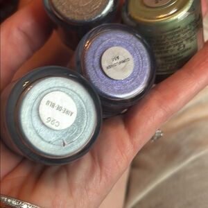 Set of MAC pigments in blue, purple, green, and teal. Perfect for vibrant makeup looks.