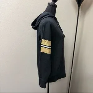 Stylish black hoodie featuring a gold fleur-de-lis design. Perfect for casual wear. Show off your team spirit with this officially licensed NFL Team Apparel New Orleans Saints hoodie. Designed for comfort and style, this women's hoodie features a bold embroidered Saints fleur-de-lis logo on the front, complemented by gold and white sleeve stripes for a sporty look. Made from a soft fleece fabric, it offers warmth and coziness, perfect for game days or casual wear. Includes an adjustable drawstring hood and kangaroo pocket for added functionality.