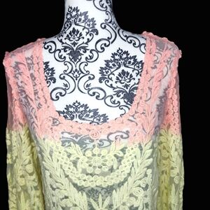 Elegant lace top featuring a beautiful ombre design in pink, yellow, and green. Perfect for adding a touch of color to your wardrobe.