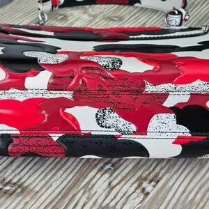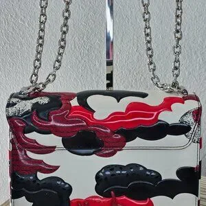 This is a great condition bag and lots of fun designs within designs. This bag is very clean and minimal signs of wear. The silver hardware is crisp and shiny. The interior is clean microfiber fabric with an interior wall pocket. Can be worn as a shoulder bag or crossbody.