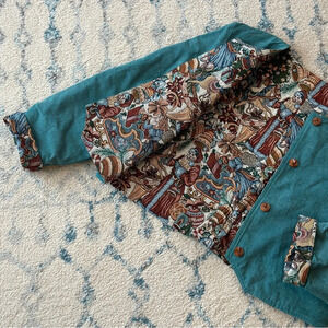 Reversible Jacket by Berry Ellen - tapestry/canvas - wooden buttons - Christmas themed - versatile - well made - pre owned but hardly worn - size L - made in Canada