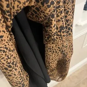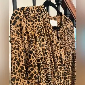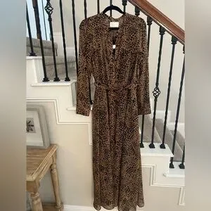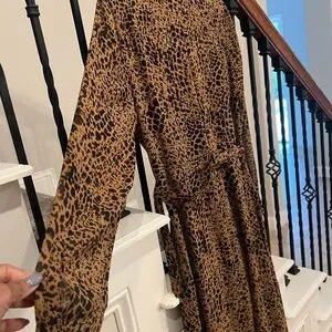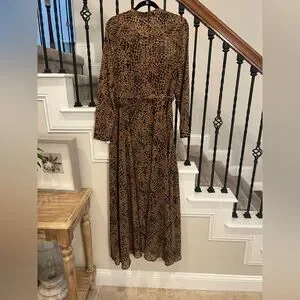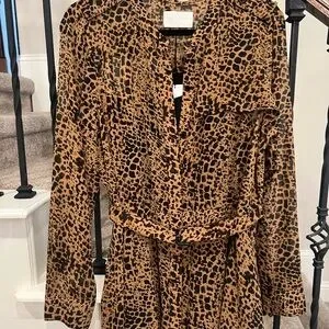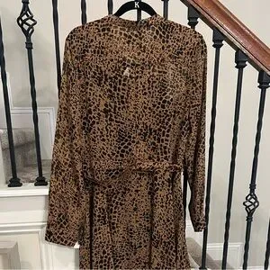 Embrace your wild side with this stunning leopard print belted shirtdress. Featuring long sleeves and a flattering fit, this dress is perfect for any occasion. Brand new! Size 14; slip dress underneath; 100% polyester and machine washable. Perfect for your spring outings! The bold brown and black pattern adds a touch of elegance and style.