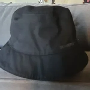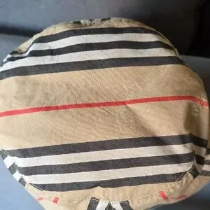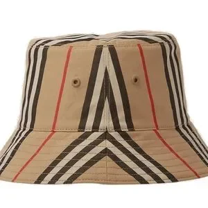 Burberry Classic Check Bucket Hat with black, red, and tan stripes. Reversible. Unisex. 100% cotton.