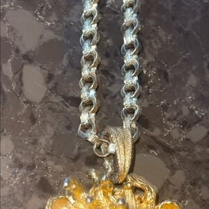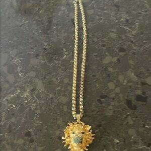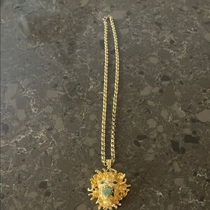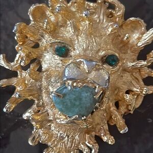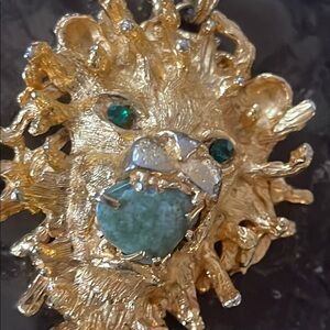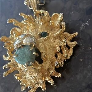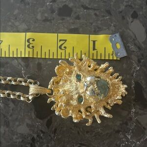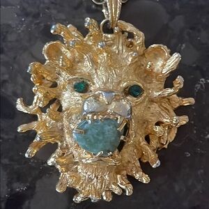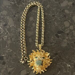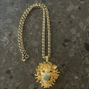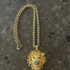 This exquisite necklace features a detailed lion's head pendant in luxurious gold, accented with vibrant green gemstones. The intricate mane design adds a dramatic flair, making it a standout piece in any jewelry collection.