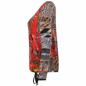 This vibrant women's top features a unique patchwork design in red, brown, and black. Perfect for adding a pop of color to your wardrobe.