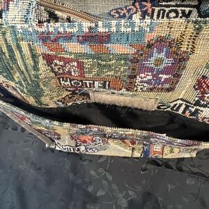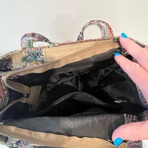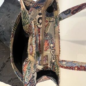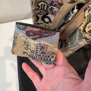 Large outside pockets, 1 with zipper. One inside pocket and Tote Zips across top, 2 handles. One small coin purse attached inside.
