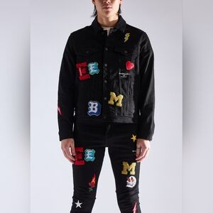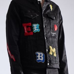 Stylish black denim jacket with vibrant patches. Features lightning bolt, heart, and letter designs.