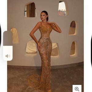 Shine in this stunning gold evening gown, perfect for special occasions. The intricate design and luxurious fabric make it a standout piece.