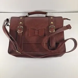 Stylish brown satchel featuring a bow accent and gold hardware. Perfect for everyday use.