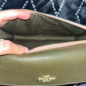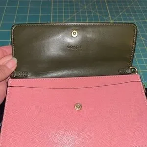 Chic Coach wristlet clutch in pink and brown. Features a wrist strap for easy carrying.