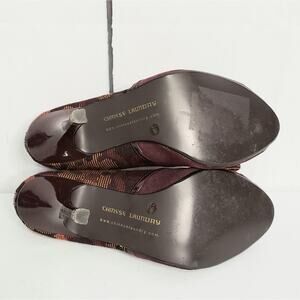 EUC: Stylish, red/purple fabric & patent leather trim pumps with peep toe/bow charm accent/slim heel/slip on by Chinese Laundry. In excellent pre-owned condition with minimal wear. **Disclosure: there are faint scuff marks/light tread wear/small nicks on the heels. Please see pictures.