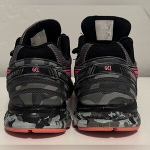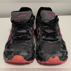 ASICS T59AQ gel scram 2 running shoes. Experience comfort and style with ASICS women's running shoes. Featuring a sleek black design with vibrant pink accents, these shoes are perfect for your active lifestyle.