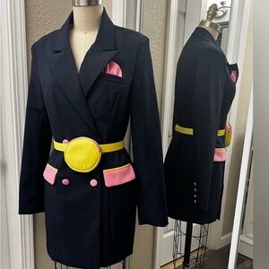 Stylish navy blazer dress featuring bright yellow and pink accents. Includes a unique yellow belt and pink pocket square.