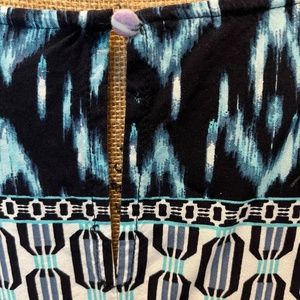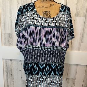 black/white/lavender/turquoise/dusty blue; 25” center front neckline to hem; 28” center back neck to hem; 5” open placket with matching button back center; 100% rayon; like new very good condition. No pets. No smoking home. No rips. No tears. Ready to wear. Refer to picture as part of description.