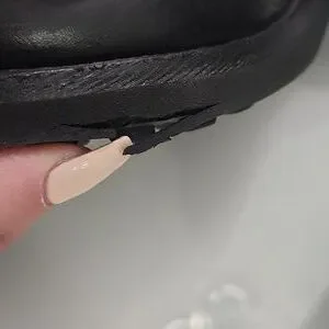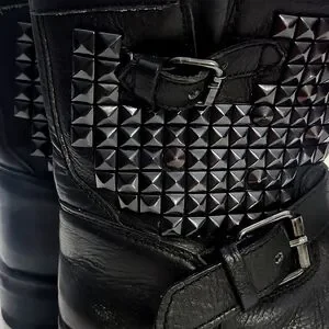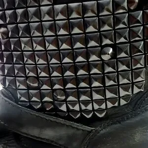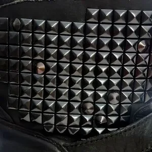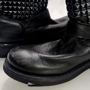Stylish black ankle boots with studded design. Perfect for a bold look. These are the boots I'd always dreamed of finding, except this pair is too small. They are a 39 1/2, which to me translates to an 8 1/2. If you wear a 9, fair warning, these will not fit you. Also when I went over them they seem to have some rubber peeling off however these have never even been worn outside. No studs missing, just a cool design, black on black. And if you like these, you're probably not going to care about the flaw. Shown close up and far away in pics. Price reflects imperfection.