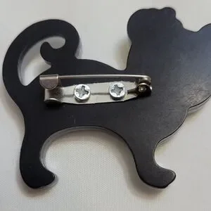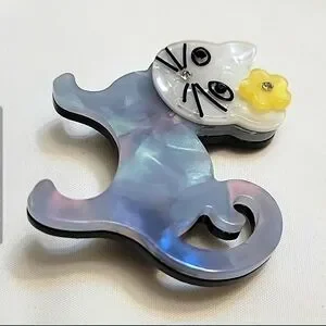 Adorable triple layered acrylic cat brooch. Pearly white face with a yellow flower and tiny rhinestone for nose and center of flower. Body of cat is pale and dark blue and pink. Bottom and back is solid black acrylic with a straight back pin and barrel clasp. Brooch measures 1 5/8" high x 2" wide. New without tags.