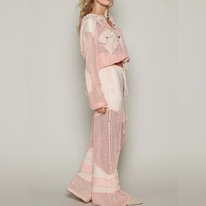 Boho Pink Chic Trendy Open Knit Button Down Pocket Front Hooded Shirt Top