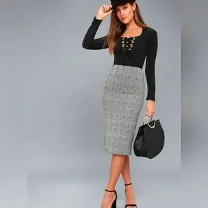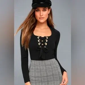 lightweight, stretch knit top features a square neckline, and a fitted, princess-seamed bodice with chiffon lace-up detailing and oversized, silver grommets. Long sleeves, with ribbed trim. Rounded hem, showcasing a distinctive corset-style lace-up detail at the front.