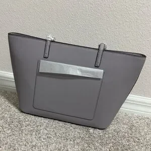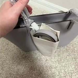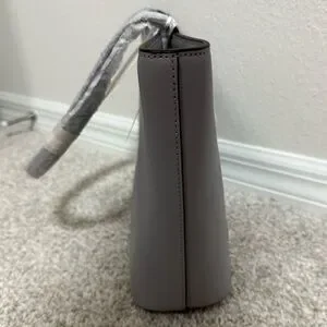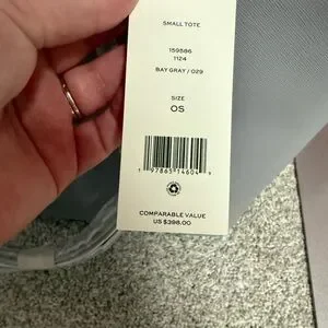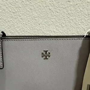 This is a brand new and never been used small tote from the designer Tory Burch. It is called the Small Tote and is in the beautiful color called Bay Gray. The Small Tote is designed with a zippered pocket for organization. Perfectly sized for a phone, wallet and sunglasses. Carry it over the shoulder or crossbody with the removable strap.