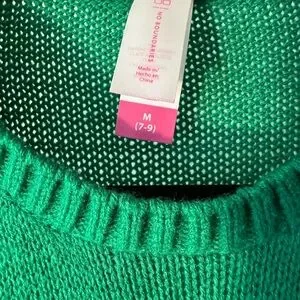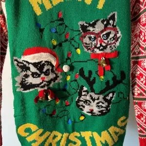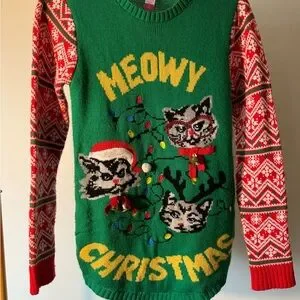 Super fun & festive 'Meowy Christmas' sweater. Features cat faces and holiday decorations on a green background with red and white patterned sleeves.