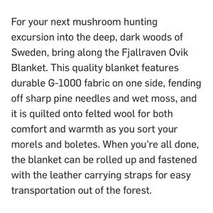 This dark olive green roll-up blanket made by fjallraven is perfect for the outdoors.Its sleek design and durable material make it a stylish and practical choice. Not sold in stores anymore. Easy carry. Can use fjallraven wax on the canvas part. New with tags