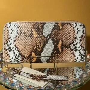 Stylish snakeskin pattern double zip wallet in brown and black. Perfect for adding a touch of elegance to your outfit. This is a double compartment wallet. Each compartment has 4 card slots and 1 bill compartment for a total of 8. Each side can also hold an 16 plus iPhone. It closes with double zippers. All metal is gold-tone. NWT